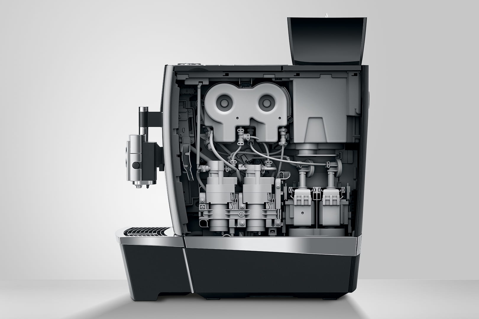 L’entretien de la GIGA X3 est tout aussi simple, logique et intuitif que son utilisation. Les produits d’entretien JURA d’origine ainsi que les programmes intégrés de rinçage et de nettoyage garantissent une hygiène certifiée TÜV par simple pression d’une touche. Le nettoyage du système de lait est, lui aussi, très bien pensé. Entièrement automatique, il se lance en appuyant sur le visuel et garantit une propreté absolue avec le lait. L’écoulement combiné massif se démonte en un tour de main. Placés sur le devant, les écoulements de lait sont facilement accessibles et peuvent être remplacés sans difficulté.